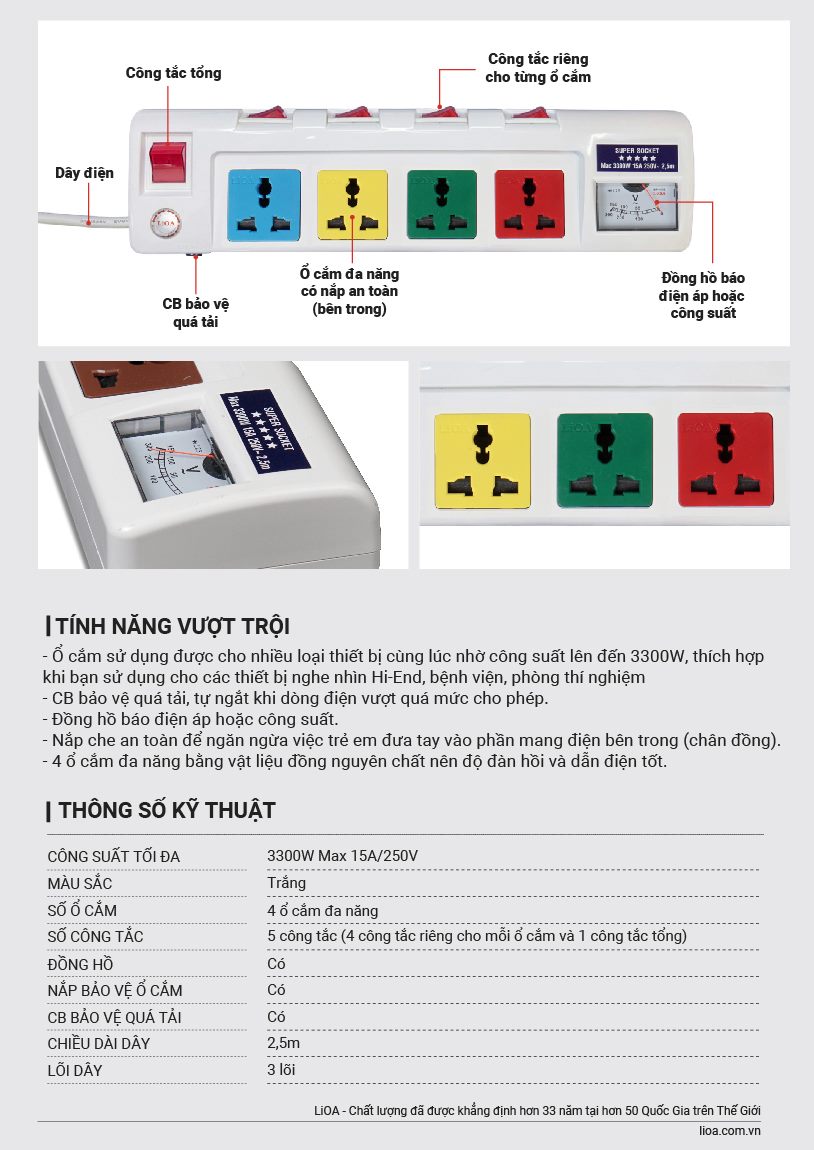 - Ổ cắm sử dụng được cho nhiều loại thiết bị cùng lúc nhờ công suất lên đến 3300W, thích hợp khi bạn sử dụng cho các thiết bị nghe nhìn Hi-End, bệnh viện, phòng thí nghiệm.