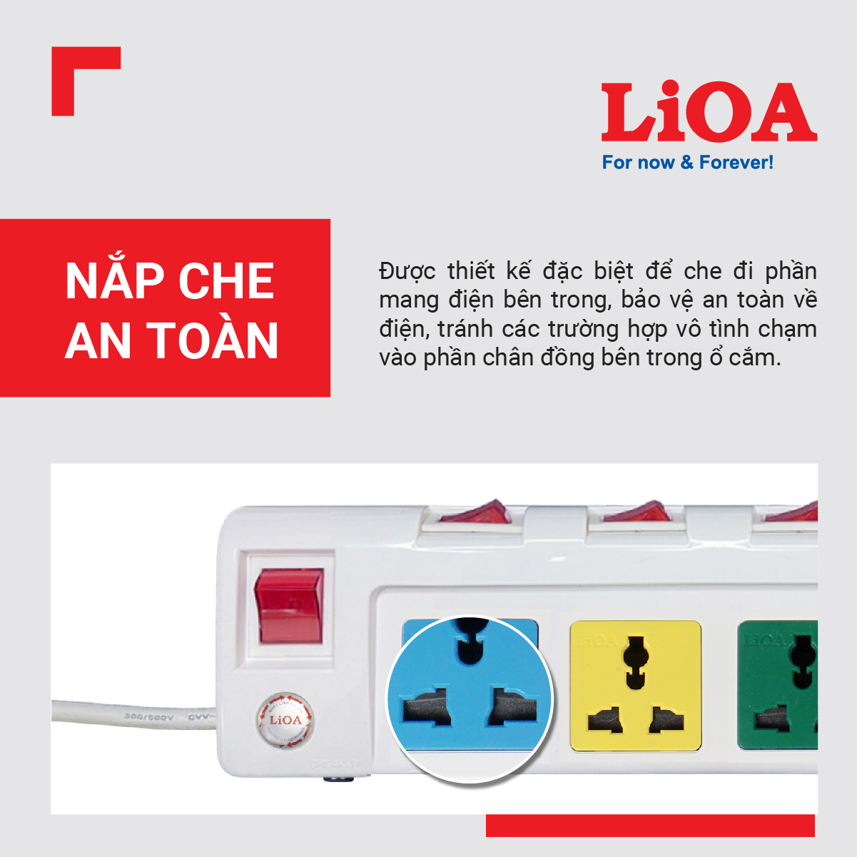 - Có nắp che an toàn để ngăn ngừa việc trẻ em đưa tay vào phần mang điện bên trong (chân đồng).
