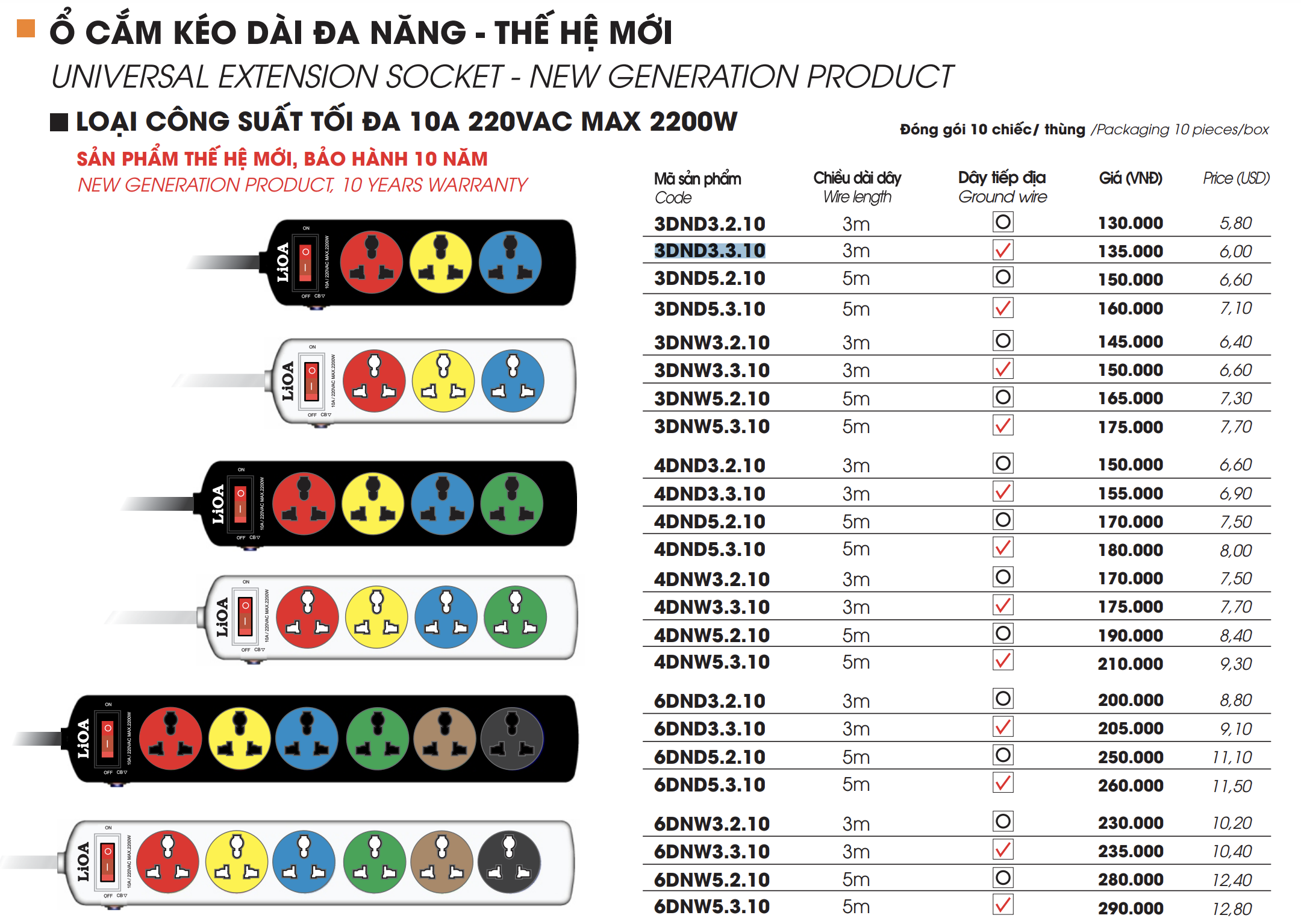 Thông số kỹ thuật Ổ cắm kéo dài đa năng LiOA 6DND3.2.10: