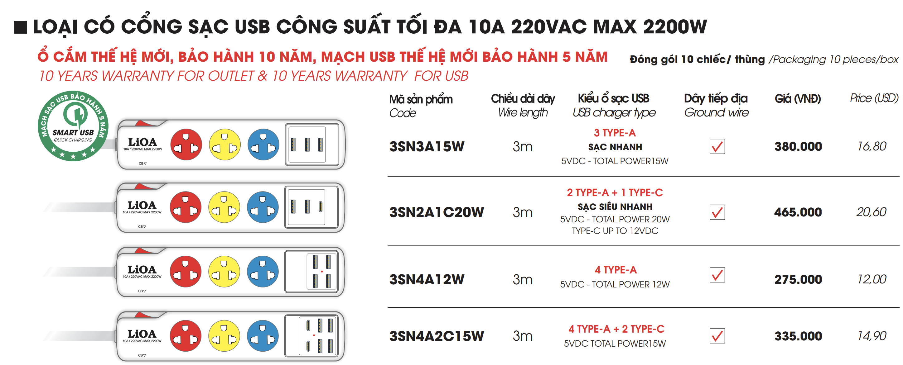LOẠI CÓ CỔNG SẠC USB CÔNG SUẤT TỐI ĐA 10A 220VAC MAX 2200W