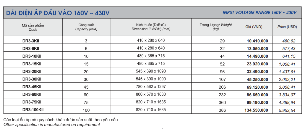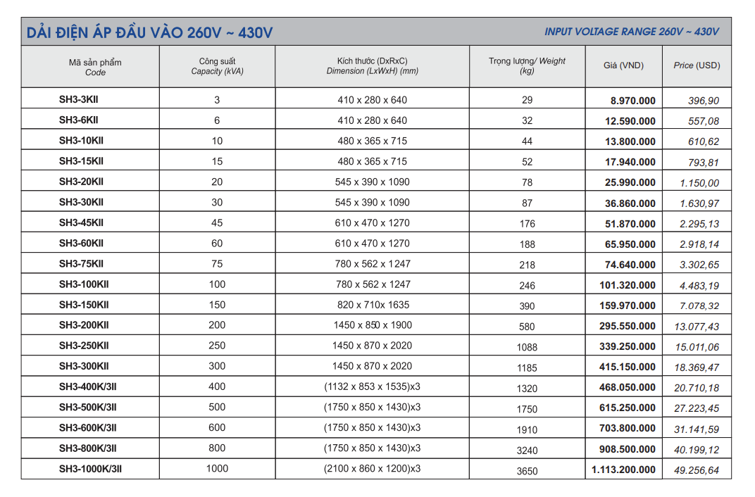 - Công suất: Từ 3KVA đến 100KVA, đáp ứng đa dạng nhu cầu từ gia đình đến nhà xưởng.