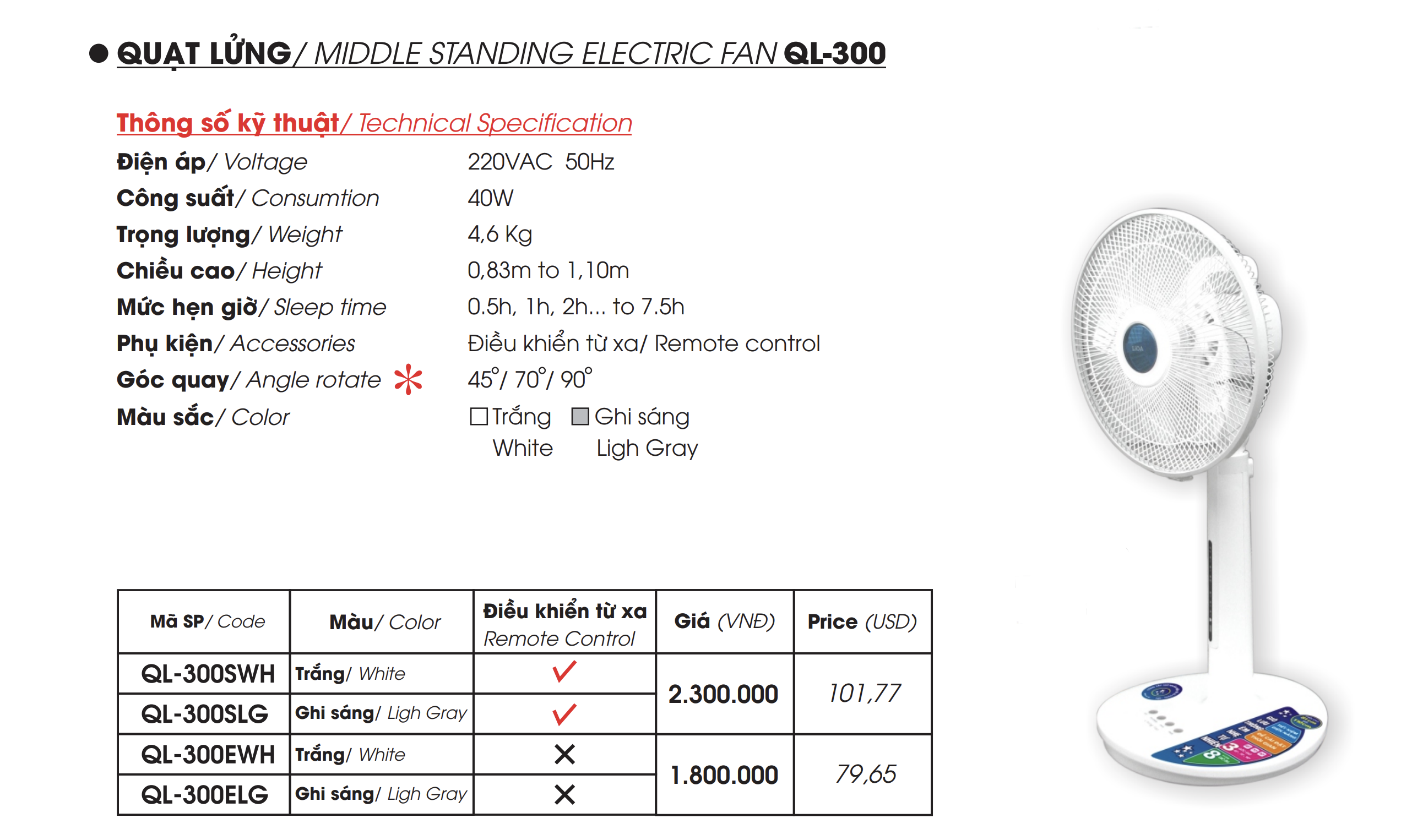 Thông số kỹ thuật Quạt lửng LiOA QL-300S: