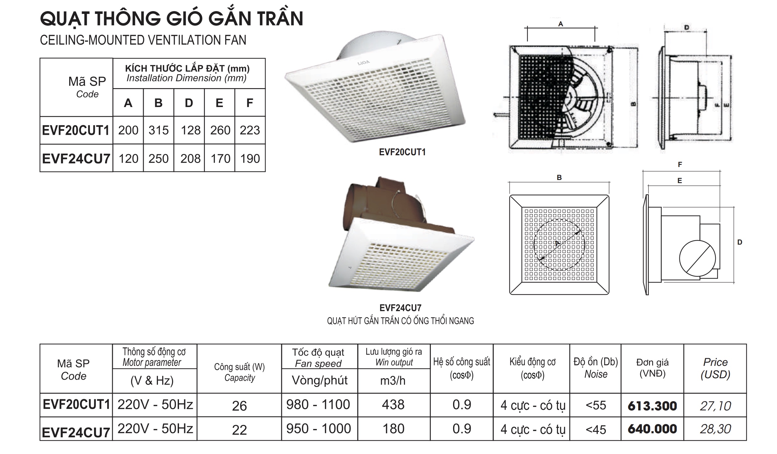 Thông số kỹ thuật Quạt thông gió gắn trần EVF20CUT1: